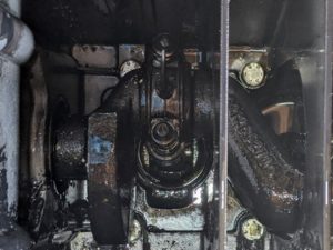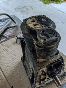 The screws to remove the cylinders are accessed from the lower pump. Here you can see the crank shaft and the tie rod ends holding the pistons in place. Thankfully, all of this is pretty tight. I don’t think I have to fix anything here because if I did, I would probable just recycle the whole thing rather than take it to a machine shop for new bearings and resurfacing.